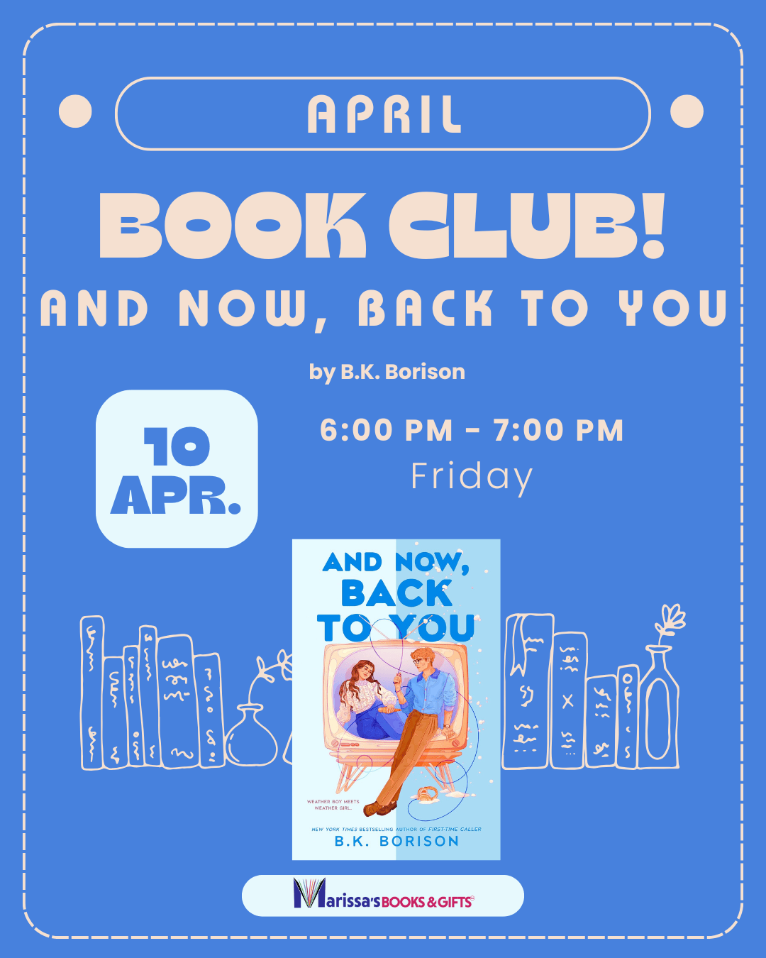 Join us on Friday, April 10th at 6:00 PM to discuss "And Now, Back to You" by B.K. Borison!