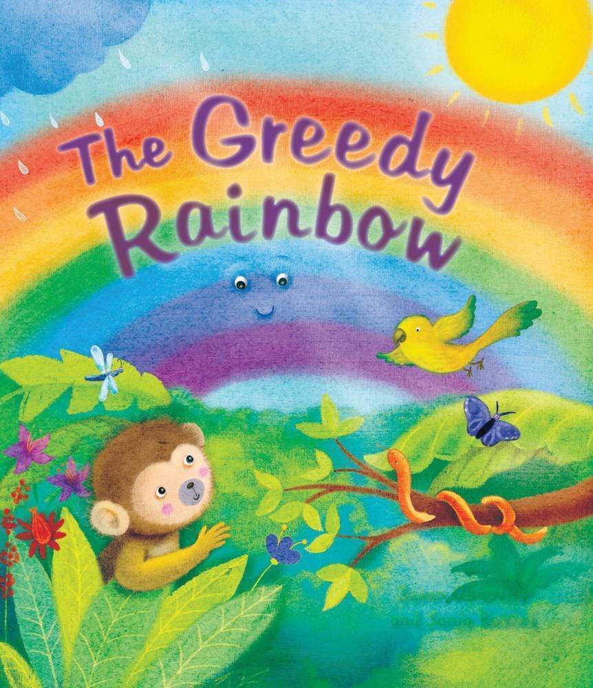 When one little rainbow lands in the rainforest, it causes BIG trouble! Monkey finds the rainbow in a tree and decides to show it to his friends. But as he swings through the forest something strange starts to happen the rainforest is losing its colors, while the rainbow is growing bigger and bigger! Before long, the rainbow is huge, but the jungle is grey and the animals are very sad. Monkey tells the rainbow off for being greedy and eating all the colors. The rainbow starts to cry, soaking the forest with multicolored tears. Everything and everyone gets their colors back. Just not their original colors.