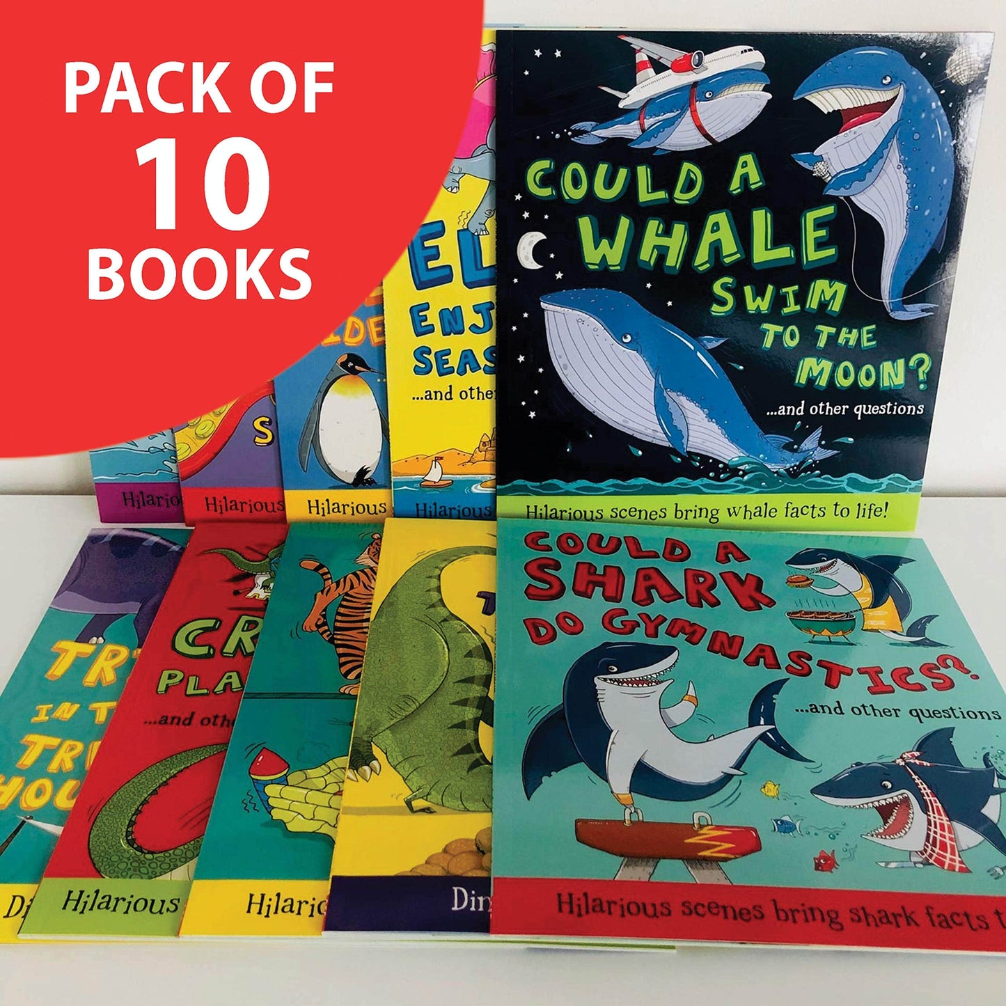Included in this bundle are: Could a Penguin Ride a Bike?, Could an Octopus Climb a Skyscraper?, Could a Monkey Waterski?, There's a T-Rex in Town, There's a Triceratops in the Tree House, Could a Tiger Walk a Tightrope?, Would an Elephant Enjoy the Seaside?, Could a Shark do Gymnastics?, Could a Crocodile Play Basketball?, and Could a Whale Swim to the Moon?